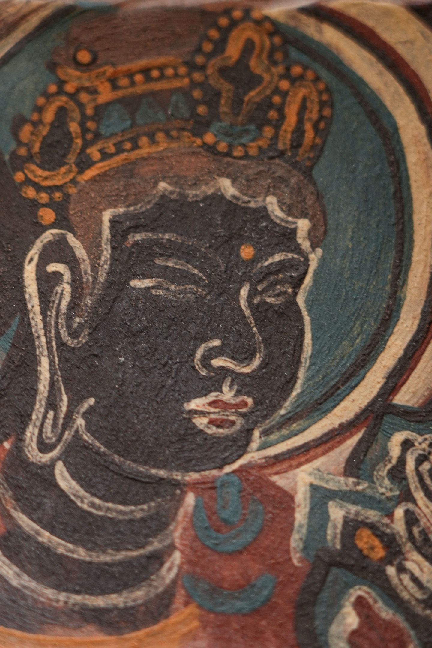 Rooted in the iconic murals of the Mogao Grottoes, this totem features a meticulously hand-painted depiction of a Bodhisattva, with a serene expression, an ornate crown, and a hand raised in a sacred mudra. Every detail is rich with symbolic meaning: