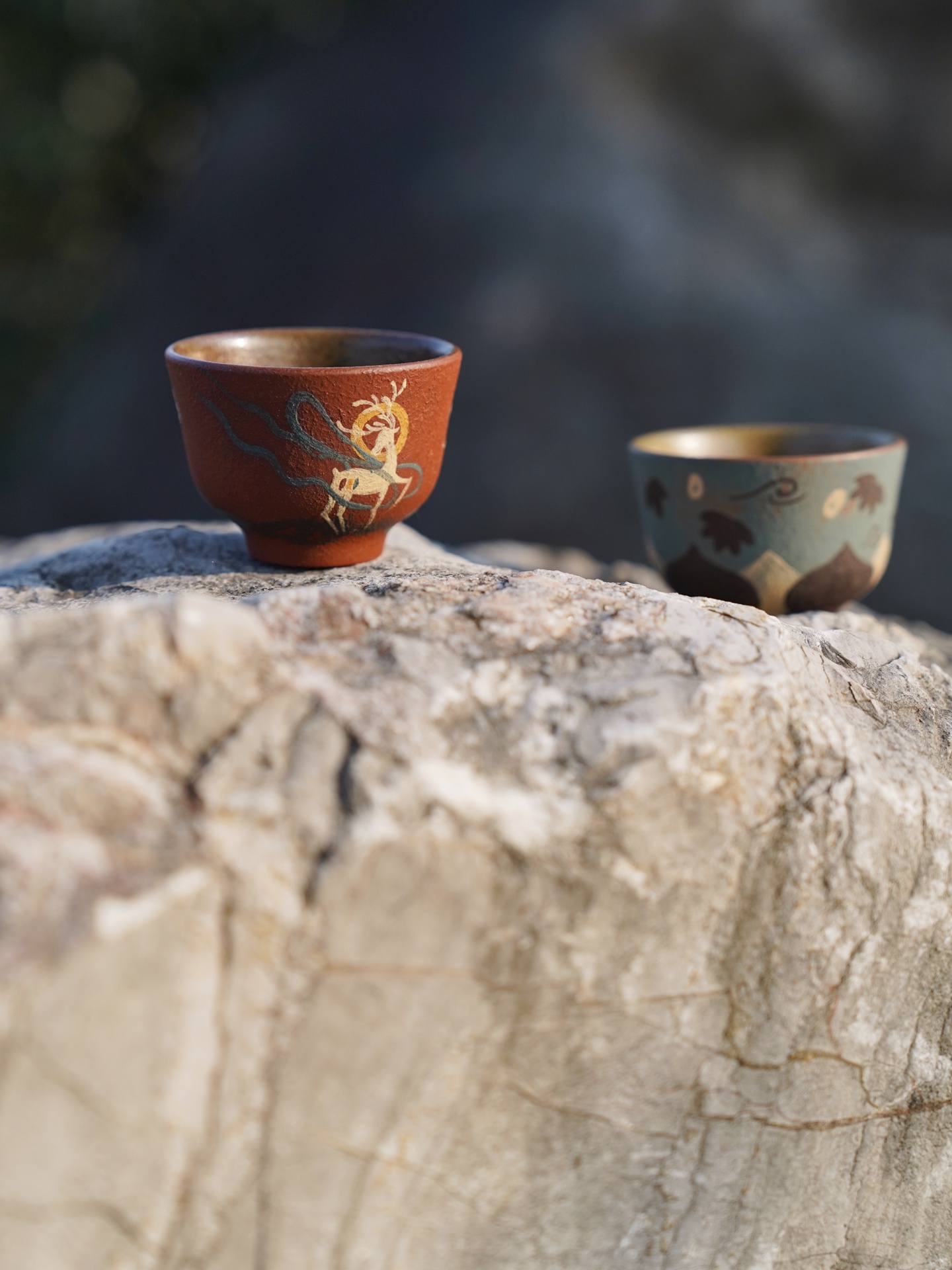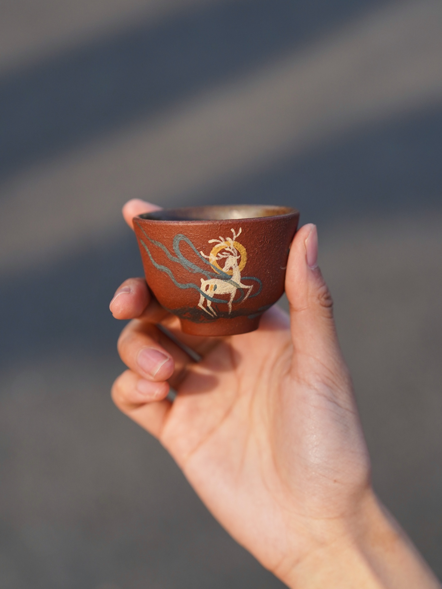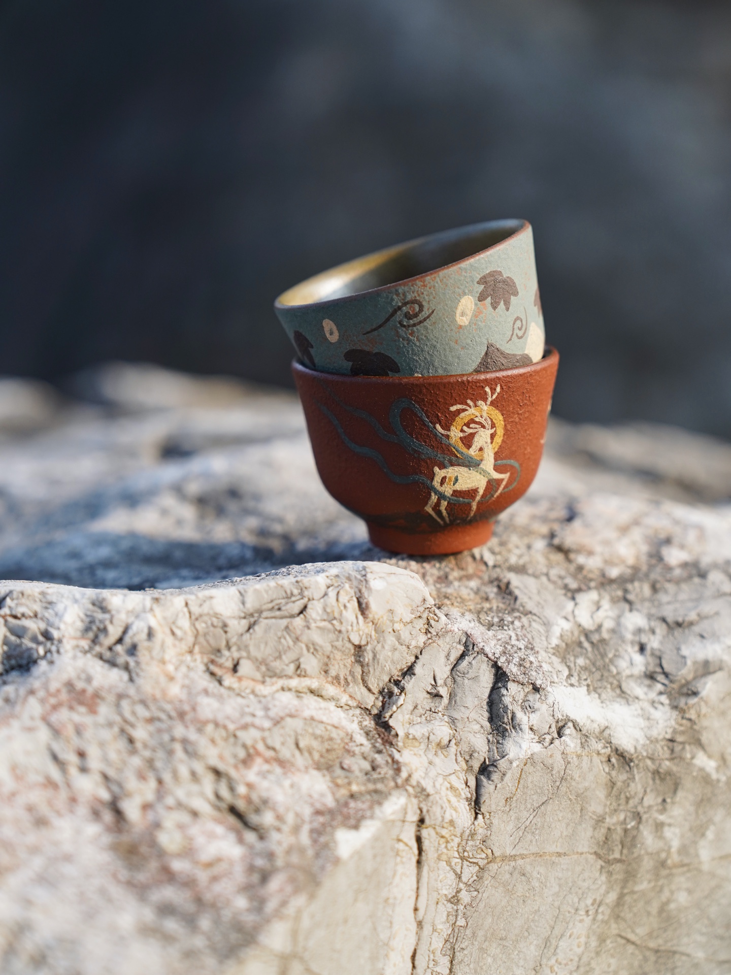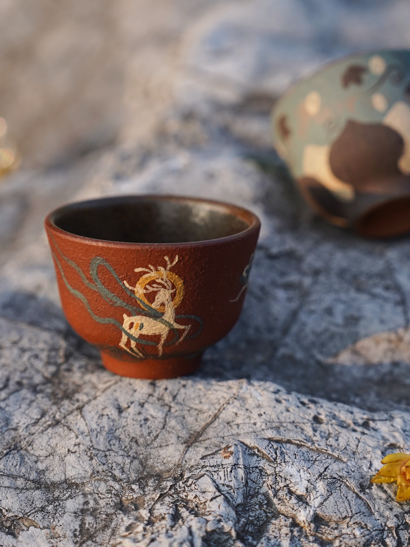 The exterior surface is decorated with hand-painted details inspired by Dunhuang mural art. The deep red clay background highlights the delicate illustration of the Nine-Colored Deer, while the lotus cup presents a tranquil landscape motif reminiscent of the ancient Silk Road environment. Together they form a harmonious pair that blends storytelling, symbolism, and craftsmanship.